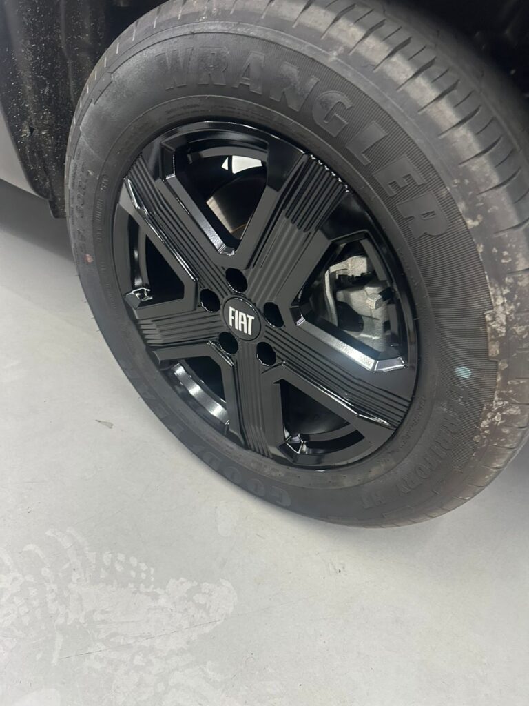 2. Aplicação do Vinil: O material escolhido, digamos um elegante Black Piano (Preto Brilhante), é cuidadosamente aplicado. Dessa forma, o adesivo é moldado com precisão sobre todos os contornos e raios da roda. A atenção ao detalhe é crucial, como resultado, garantindo que o filme abrace a roda até a borda e ao redor do centro, preservando o emblema da Fiat se desejado, ou o envelopando para um visual total black.